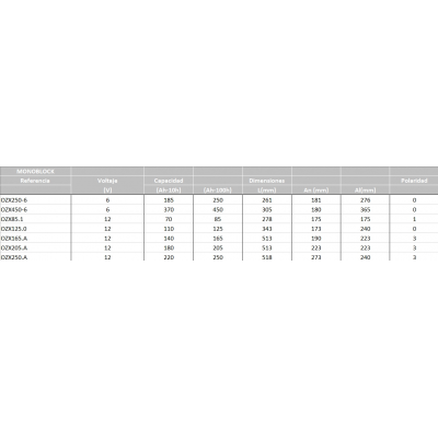 BATERIA OZONYX MONOBLOCK 12V Referencia: OZX85.1 - Voltaje 12 - Capacidad (Ah-10h) 70 - (Ah-100h) 85 - Dimensiones: L(mm) 278 - An (mm) 175 - Al(mm) 175 - Polaridad 1