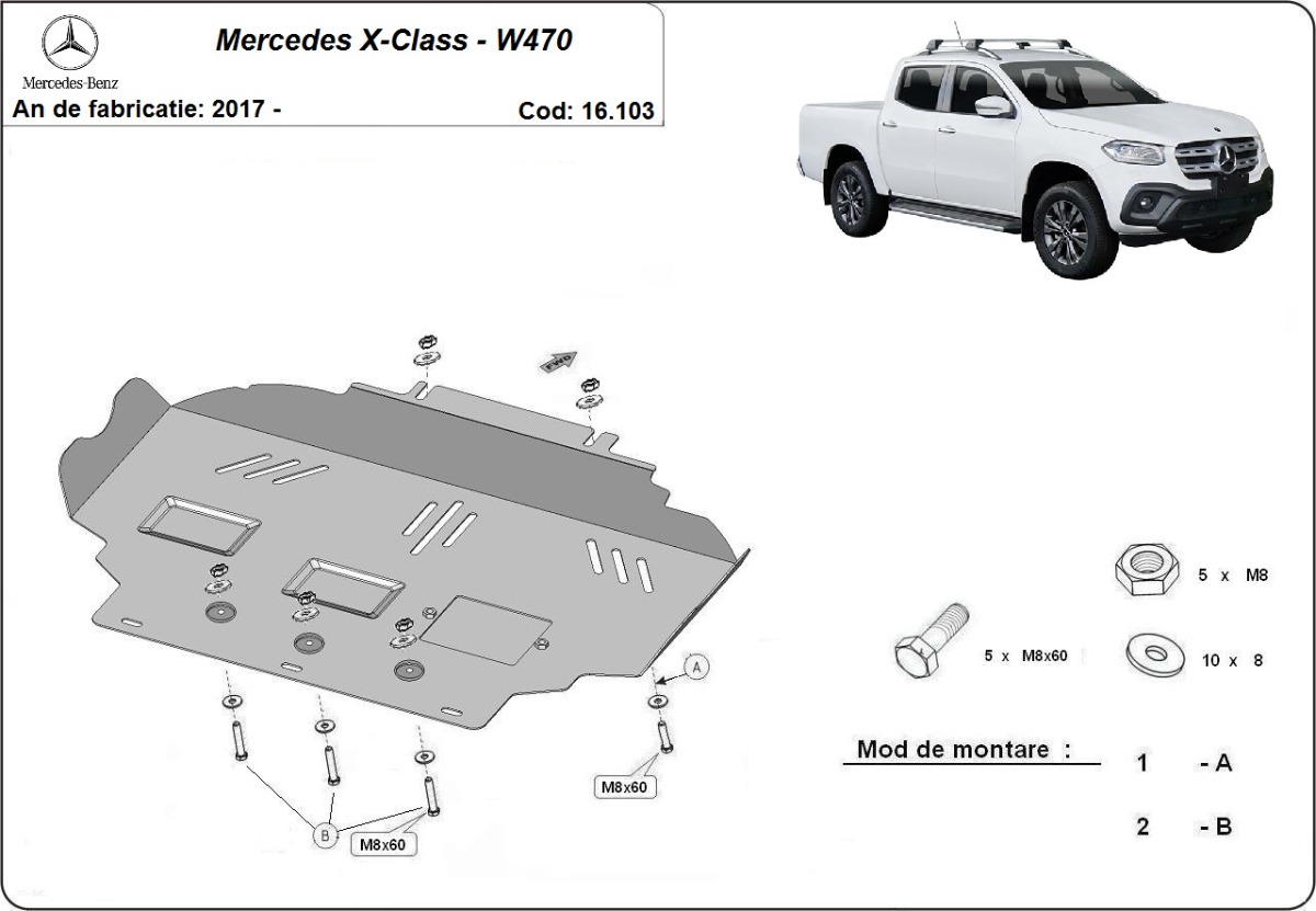 Cubre carter de Acero para Mercedes Clase X W470 Año: 2017 - 2020 Motor: Todas las motorizaciones Caja cambio: Grosor: 2.5mm Agujero para aceite: Con hueco para el tapon de aceite. Protege: motor Descripcion: Protecciones de acero o aluminio para el motor y la caja de cambios.