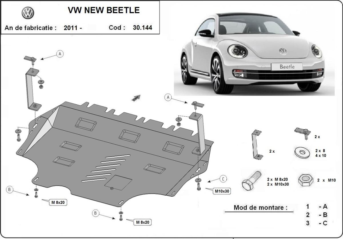 Cubre carter de Acero para Volkswagen New Beetle Año: 2011 - 2017 Motor: Todas las motorizaciones Caja cambio: Grosor: 2mm Agujero para aceite: Con hueco para el tapon de aceite. Protege: motor, caja de cambios Descripcion: Protecciones de acero o aluminio para el motor y la caja de cambios.