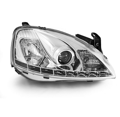 OPEL CORSA C 11.00-09.06 FAROS DELANTEROS LUZ DIURNA CROMADOS - Faros delanteros luz diurna LED. - Articulo nuevo, Pareja (Izquierdo+Derecho), Homologacion Europea E-Marcado- para uso legal. DETALLES: Luz posicion: LED- Luz intermitente:P21W - Luz corta:H1 incluida - Luz larga: H1 incluida - Regulacion: Electrica (Regulador electrico no incluido) LED El tiempo de entrega del material puede ser de 7-9 dias
