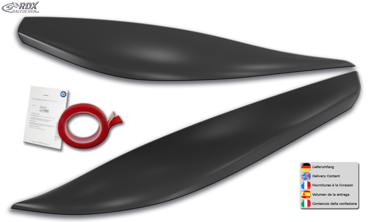 Pestañas de faros RDX para FORD Kuga 2 (DM2 / 2012+) Cejas de luz Rdx Racedesign Contenido del envÃo: > Pestañas de faros / Cejas de faros (izquierda y derecha) > Accesorios de instalación (cinta adhesiva) > Homologación TÜV