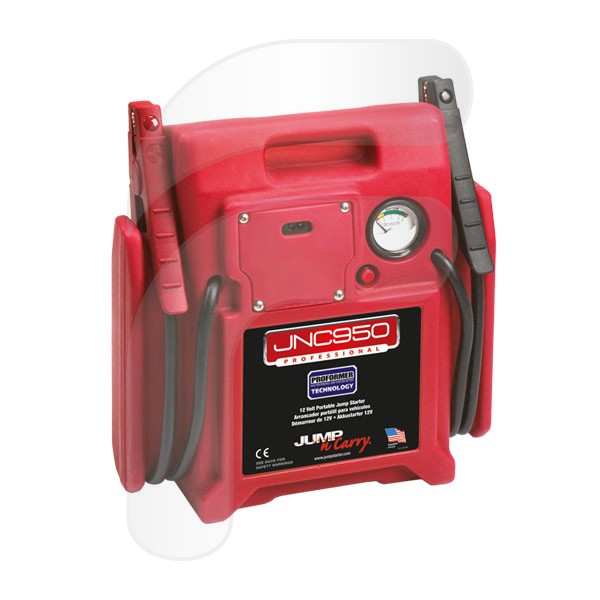 JNC950 2000 Amperios de pico Arrancador portátil de 12 Voltios Esta unidad de 12V de alto poder es una gran elección para flotas, aplicaciones industriales y náuticas donde el requerimiento deprofundidad de amperios de arranque es la norma, y no la excepción. Características: batería Clore PROFORMER,cargador integrado totalmente automático, voltímetro y cables de 117 cm.