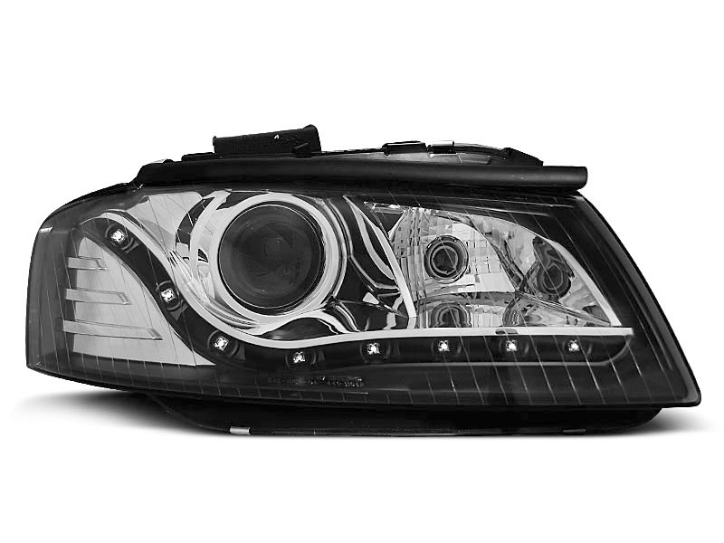 AUDI A3 8P 05.03-03.08 FAROS DELANTEROS LUZ DIURNA FONDO NEGRO - Faros delanteros luz diurna LED.Tipo Hi-Low (cruce y larga). - Articulo nuevo, Pareja (Izquierdo+Derecho), Homologacion Europea E-Marcado- para uso legal.