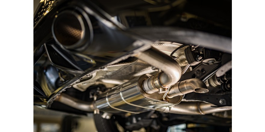 The system is delivered in 6 parts: rear silencer, front silencer and 4 tailpipes which are individually connected to each other via plug connections.