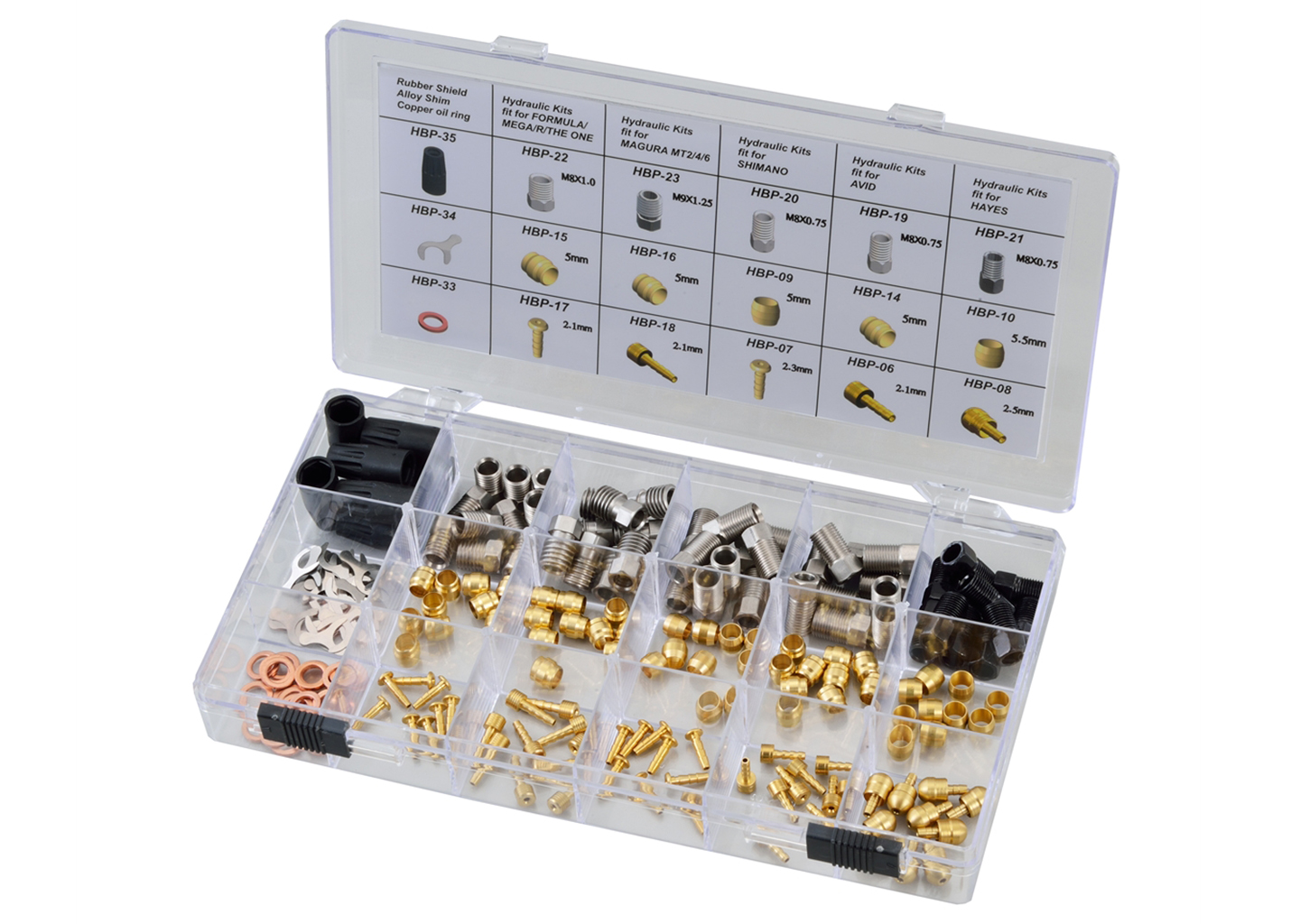 Barbieri, Workshop accessories, accessories for hydraulic disc brake hoses, universal set with 200 pieces, Olive & Pin, screw, rubber seal and diverse small parts, for SHIMANO, MAGURA, AVID, HAYES, FORMULA,