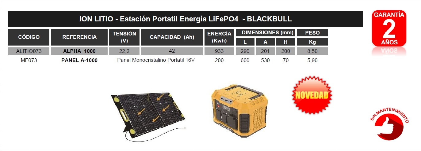 BATERIA BLACKBULL PANEL A-1000 BATERÍAS DE LITIO Panel Monocristalino Portatil 16V GARANTIA 2 AÑOS - SIN MANTENIMIENTO