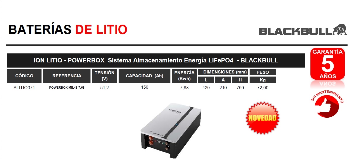BATERIA BLACKBULL POWERBOX MIL48-7,68 BATERÍAS DE LITIO ION LITIO - 150Ah - 7,68Kwh POWERBOX Sistema Almacenamiento Energía LiFePO4 - BLACKBULL - GARANTIA 5 AÑOS - SIN MANTENIMIENTO