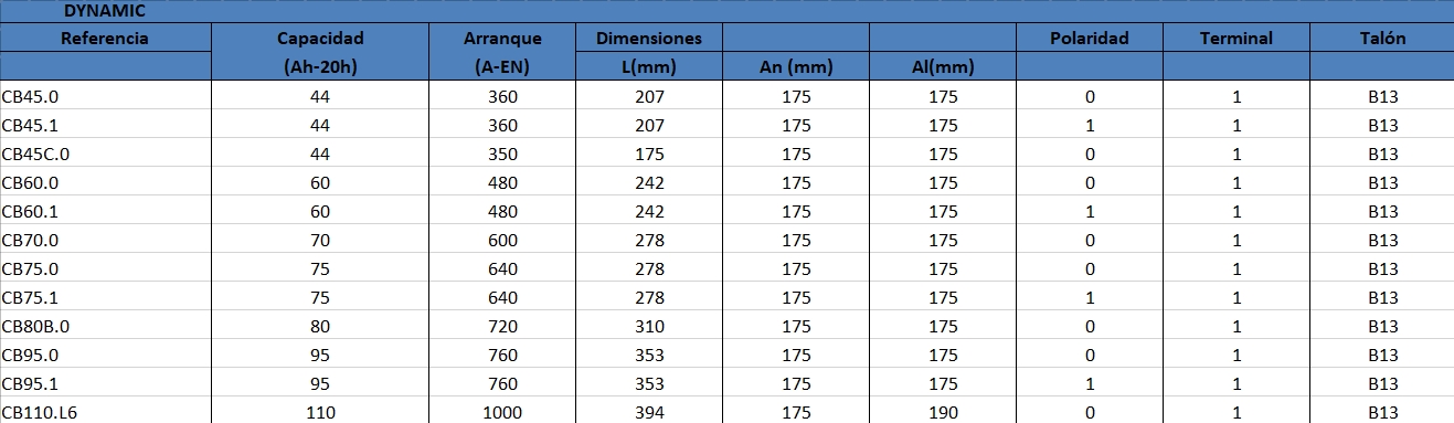 BATERIA CEMA DYNAMIC Referencia: CB95.0 - Capacidad (Ah-20h) 95 - Arranque (A-EN) 760 - Dimensiones: L(mm) 353 - An (mm) 175 - Al(mm) 175 - Polaridad 0 - Terminal 1 - Talón B13