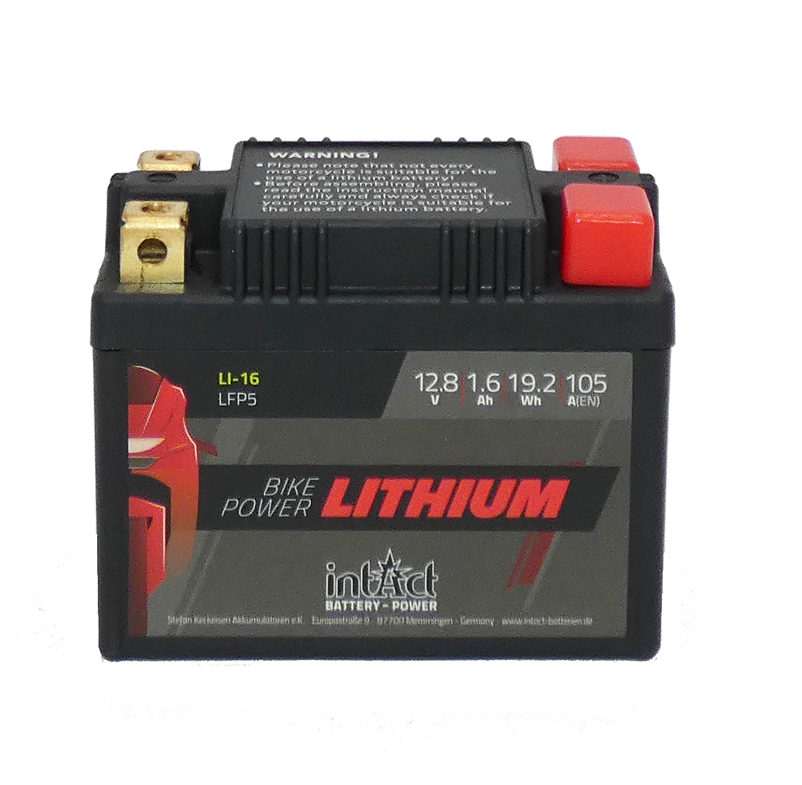 BATERIA INTACT LITHIUM Referencia: LFP05 - Válida para 3-5Ah - Capacidad (Ah-10h) 1,6 - CCA(A-EN) 105 - Dimensiones: L(mm) 107 - An (mm) 56 - Al(mm) 85 - Polaridad +/-__+/- - Terminal Cuadrado