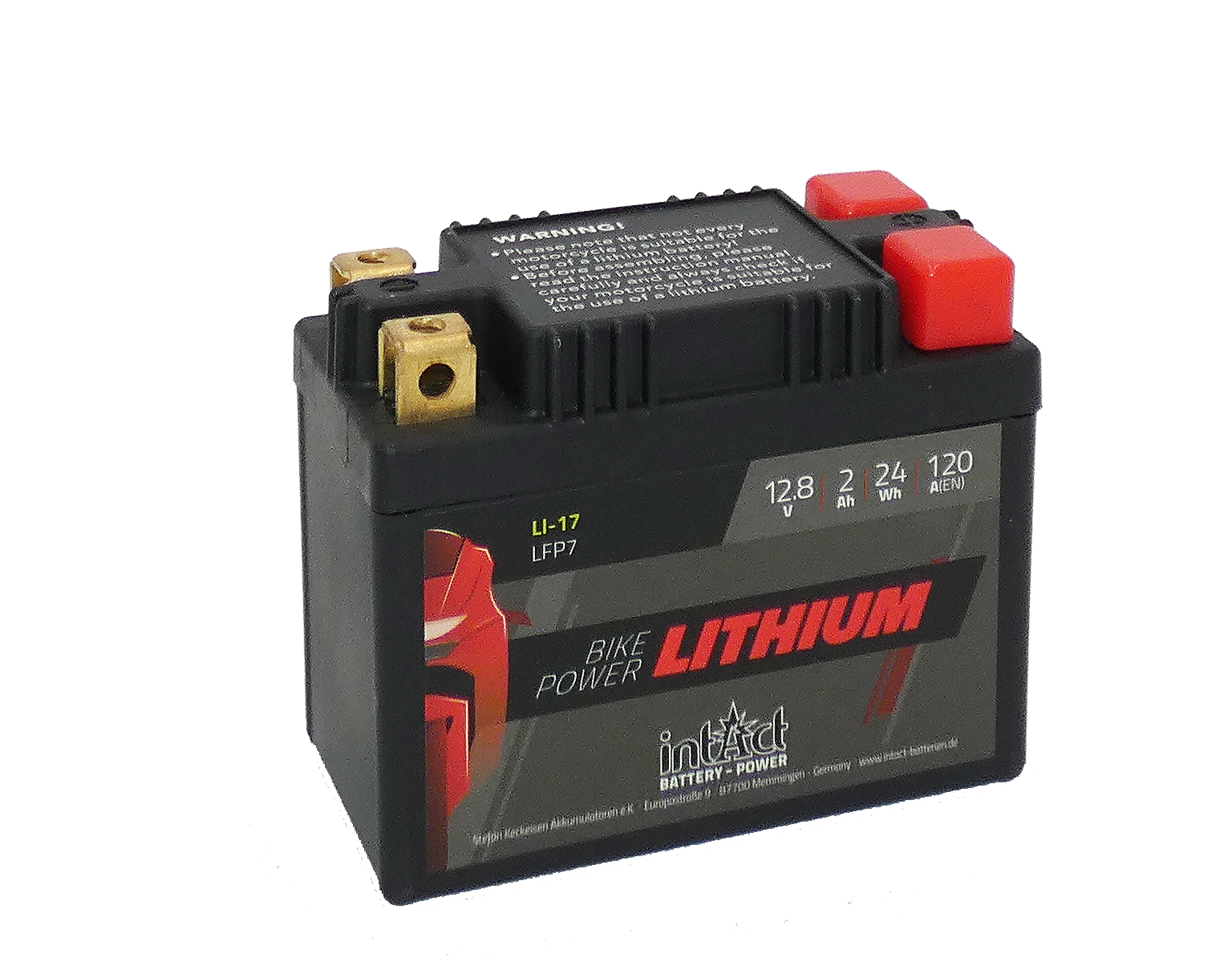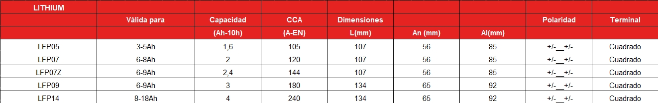 BATERIA INTACT LITHIUM Referencia: LFP07 - Válida para 6-8Ah - Capacidad (Ah-10h) 2 - CCA(A-EN) 120 - Dimensiones: L(mm) 107 - An (mm) 56 - Al(mm) 85 - Polaridad +/-__+/- - Terminal Cuadrado