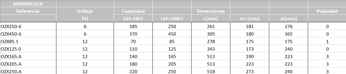 BATERIA OZONYX MONOBLOCK 12V Referencia: OZX85.1 - Voltaje 12 - Capacidad (Ah-10h) 70 - (Ah-100h) 85 - Dimensiones: L(mm) 278 - An (mm) 175 - Al(mm) 175 - Polaridad 1