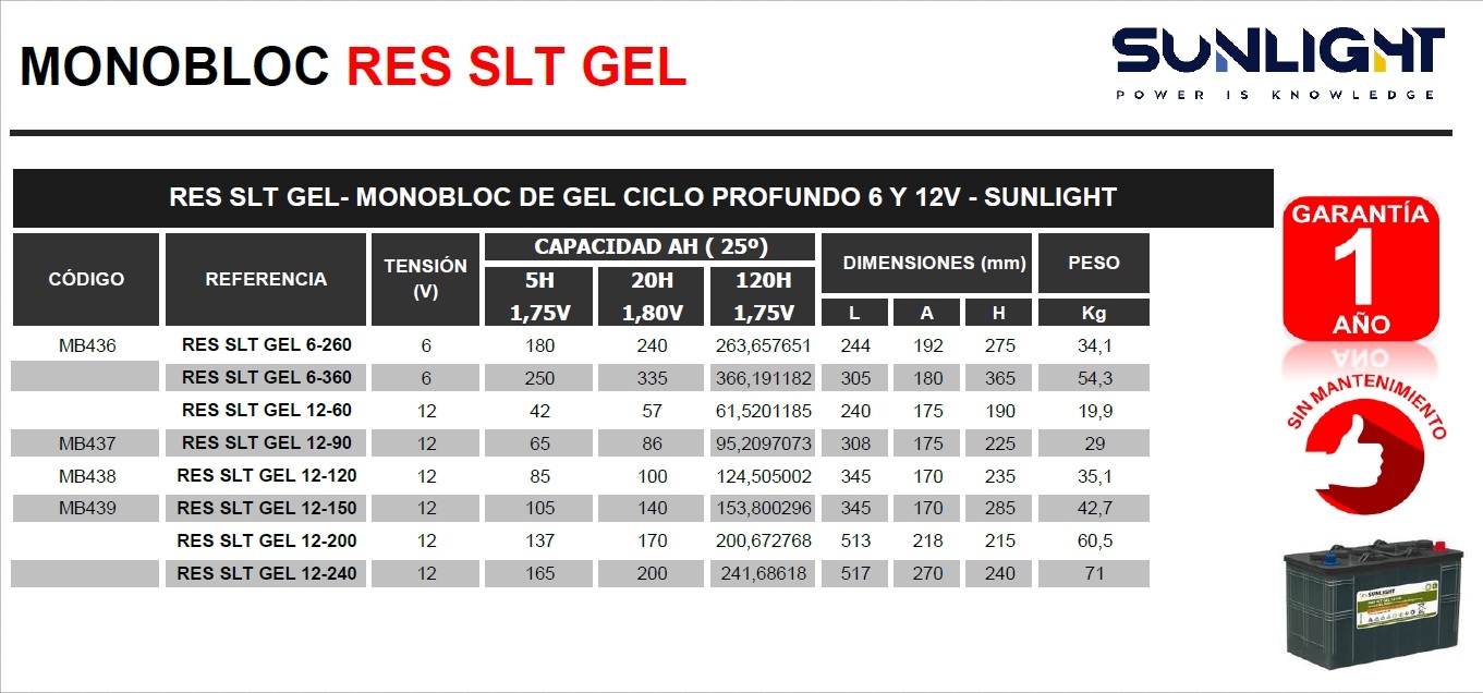 BATERIA SUNLIGHT RES SLT GEL 6-360 MONOBLOC RES SLT GEL RES SLT GEL- MONOBLOC DE GEL CICLO PROFUNDO 6V - SUNLIGHT. GARANTIA 1 AÑO - SIN MANTENIMIENTO BATERIA SUNLIGHT - RES SLT GEL 6-360 - 6 - 250 - 335 - 366,191182 - 305 - 180 - 365 Peso: 54,3