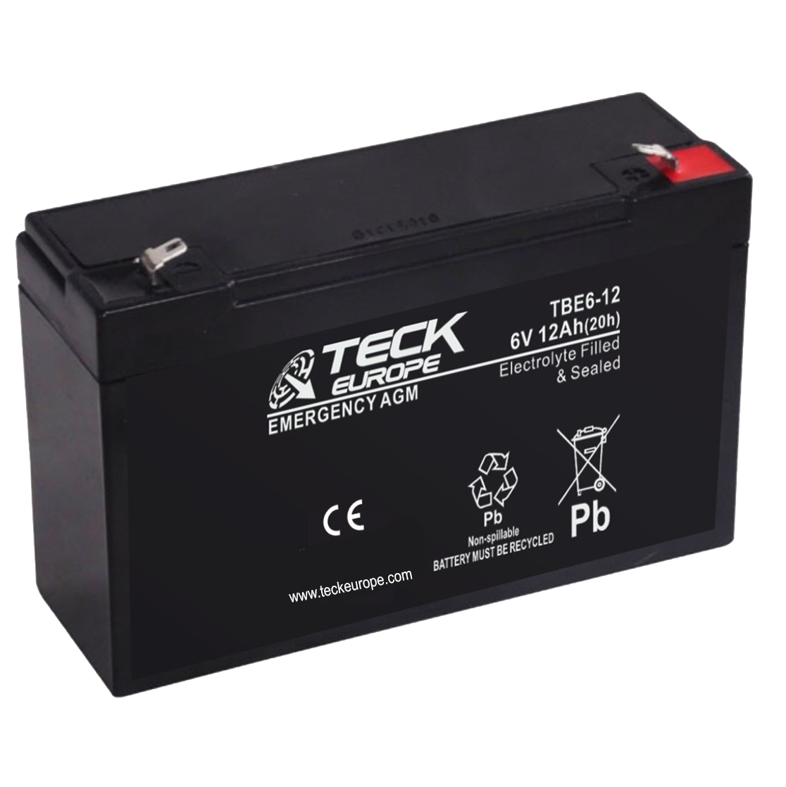 BATERIA TECK EMERGENCY AGM 6V Referencia: TBE6-12 - Voltaje 6 - Capacidad (Ah-20h) 12 - Dimensiones: L(mm) 151 - An (mm) 51 - Al(mm) 94 - Polaridad - - Terminal Faston F2