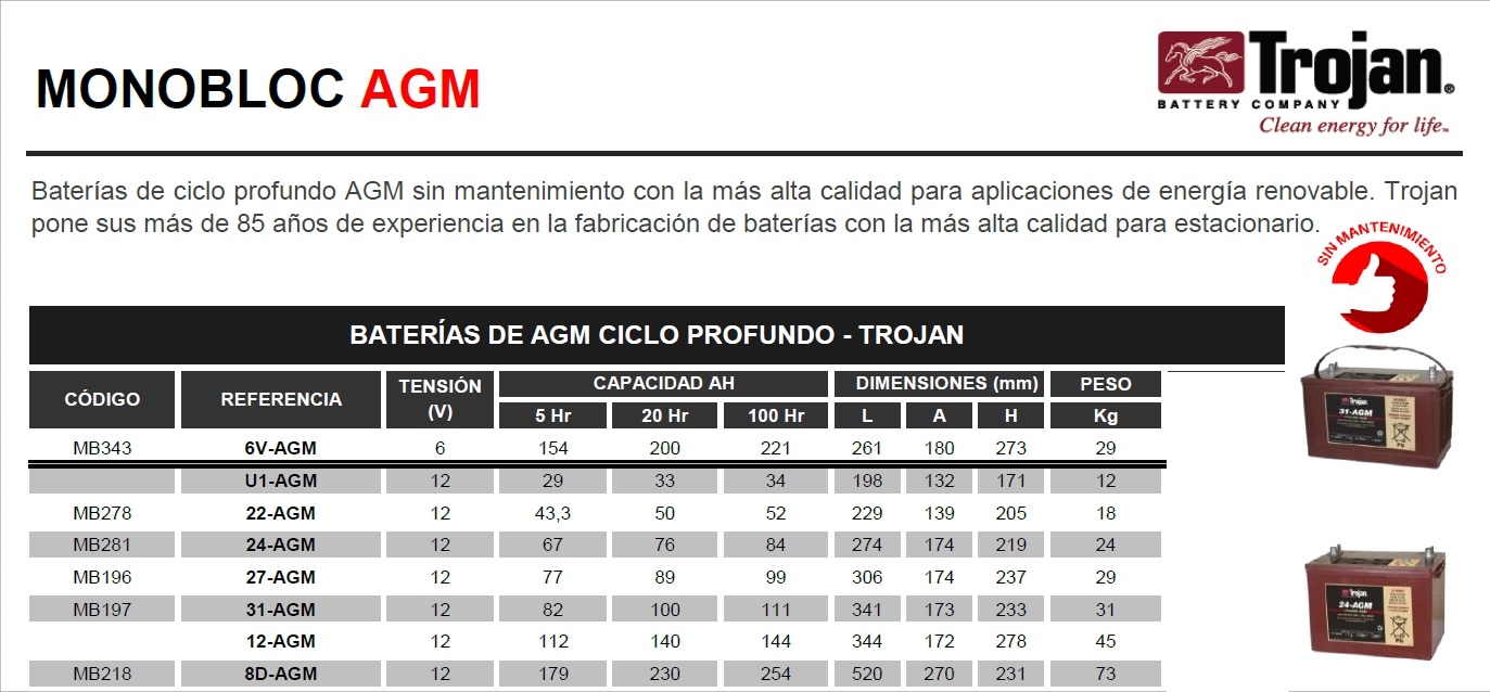 BATERIA TROJAN 24-AGM MONOBLOC AGM BATERÍAS DE AGM CICLO PROFUNDO 12V - TROJAN. Baterías de ciclo profundo AGM sin mantenimiento con la más alta calidad para aplicaciones de energía renovable. Trojan
