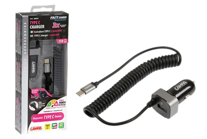 CARGADOR TIPO C 1 PUERTO USB CARGA RAPIDA 3000 mA 12/24V CABLE 150 CM