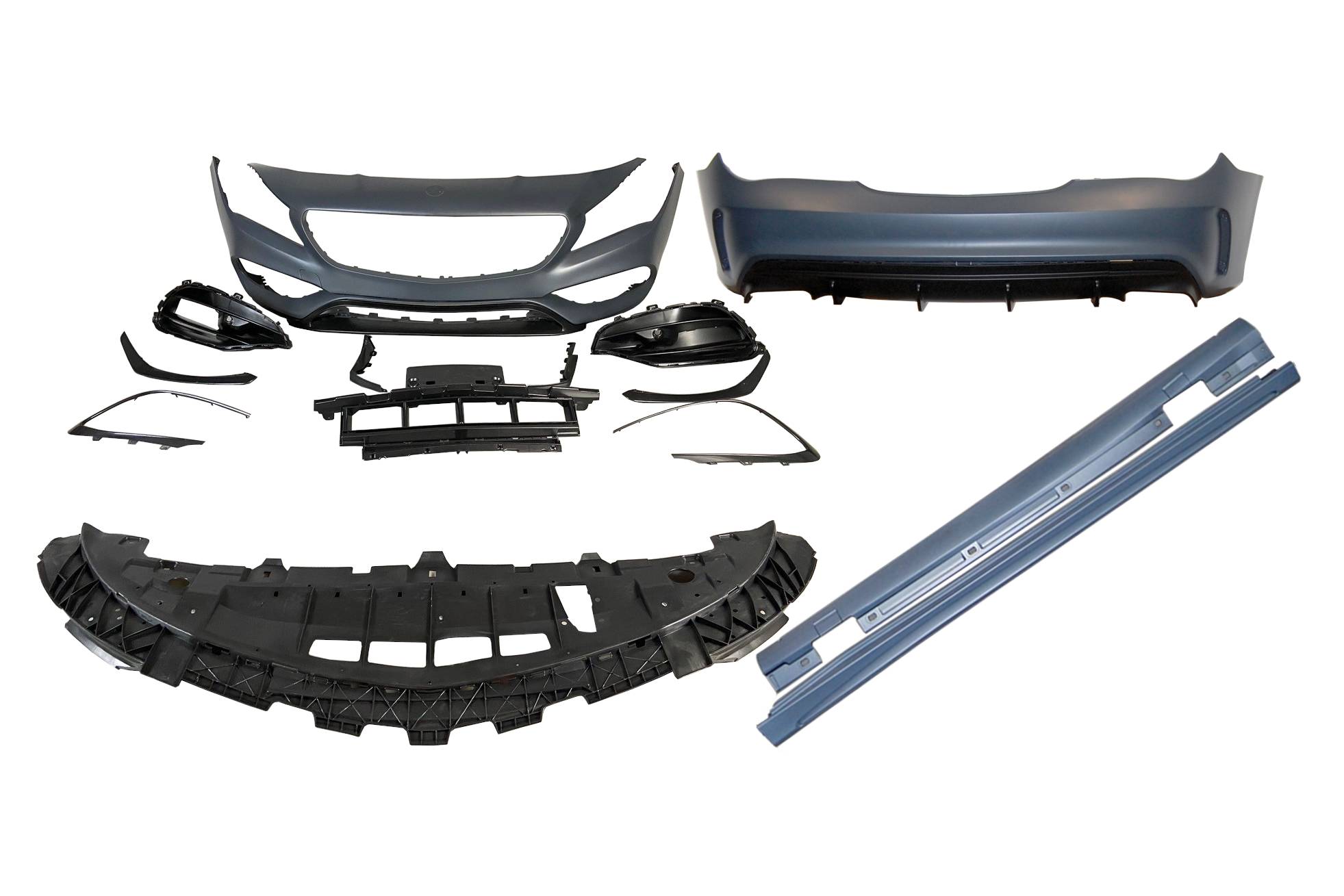 Conjunto de paragolpes delantero, paragolpes trasero y taloneras para el Mercedes W117 2016-2018 LCI 4P / SW.