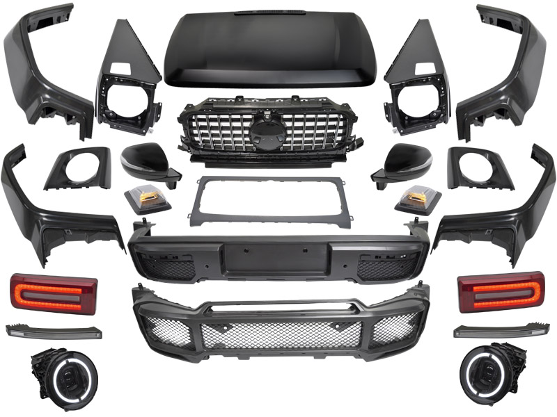 Kit de carrocería SPORT W464 BRBS LOOK Este kit está diseñado para modificar la versión estándar del W463 a una versión que se parece al modelo deportivo BRBS W464. Los parachoques y los pasos de rueda están hechos de polipropileno, el capó y los guardabarros son de acero. El kit de carrocería está disponible en dos opciones de color: con parrilla cromada o negra. También hay dos opciones para los espejos según el año del modelo convertido. Al comprar, elija qué versión de color de parrilla necesita y qué opción de espejo elige. El juego incluye: - capó de acero- parachoques delantero- parachoques trasero- pasos de rueda- parrilla: cromada o negra- guardabarros de acero- faros LED- cubiertas de faros- luces traseras LED- intermitentes LED- reflectores- luces de circulación diurna en el parachoques- espejos laterales con LED intermitente: para modelo 2005-2011 o 2012 - 2018- listones laterales decorativos- cubre guardabarros- dos versiones de rejillas laterales (dependiendo del tamaño de las tapas PDC)- dos versiones de rejilla lover (con o sin tapa de control de crucero)- refuerzos, accesorios y tornillos necesarios para la modificación EL TIEMPO DE ENTREGA PUEDE SER DE 7-9 DIAS DEPENDIENDO DE LA DISPONIBILIDAD DEL ARTICULO