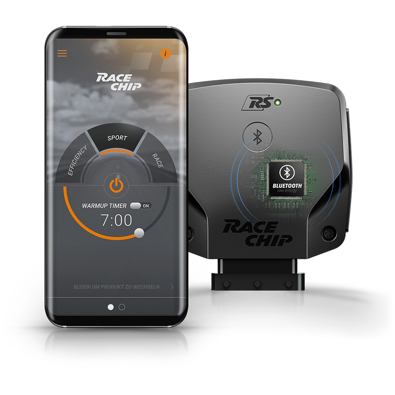 La opción de control mediante app está disponible para el RaceChip RS. Utilice su smartphone para elegir entre 3 modos de ajuste desde la aplicación RaceChip: Efficiency para ahorrar combustible en el tráfico urbano, Sport para mejorar la flexibilidad a medio régimen en carreteras abiertas, Race para obtener el máximo rendimiento. El RaceChip RS también se puede desactivar a través de la aplicación.