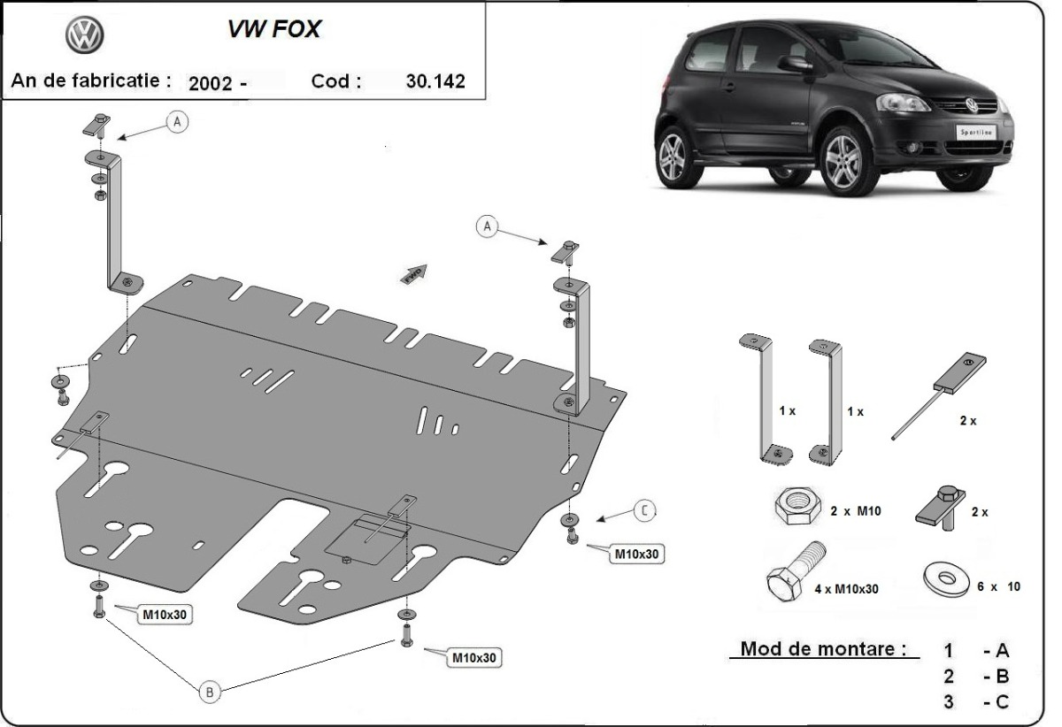 Cubre carter de Acero para VW Fox Año: 2002 - 2017 Motor: Todas las motorizaciones Caja cambio: Grosor: 2mm Agujero para aceite: Con hueco para el tapon de aceite. Protege: motor, caja de cambios, radiador, parachoques delantero Descripcion: Protecciones de acero o aluminio para el motor y la caja de cambios.