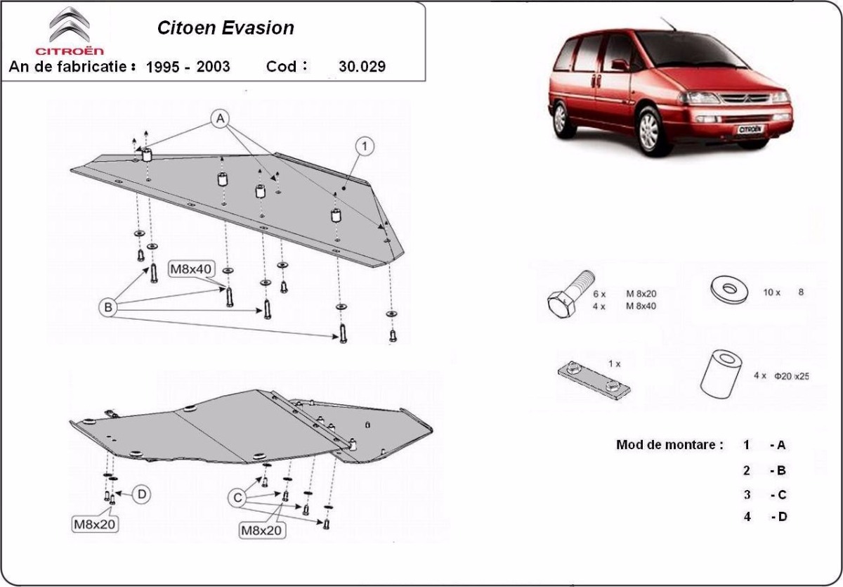 Cubre carter de Acero para Citroën Evasion Año: 1995 - 2003 Motor: Todas las motorizaciones Caja cambio: Grosor: 2mm Agujero para aceite: Sin hueco para el tapon de aceite. Protege: motor, caja de cambios, radiador, parachoques delantero Descripcion: Protecciones de acero o aluminio para el motor y la caja de cambios.