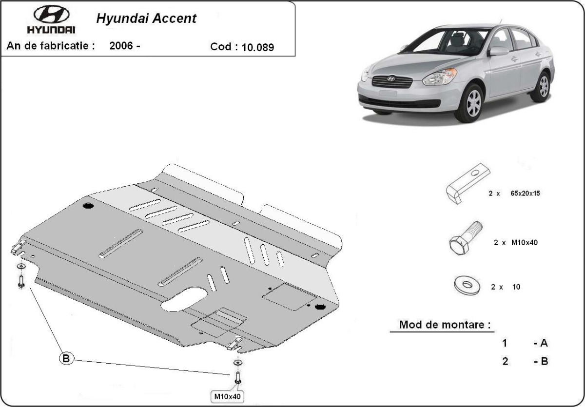 Cubre carter de Acero para Hyundai Accent Año: 2005 - 2010 Motor: Todas las motorizaciones Caja cambio: Grosor: 2mm Agujero para aceite: Con hueco para el tapon de aceite. Protege: motor, caja de cambios, radiador Descripcion: Protecciones de acero o aluminio para el motor y la caja de cambios.