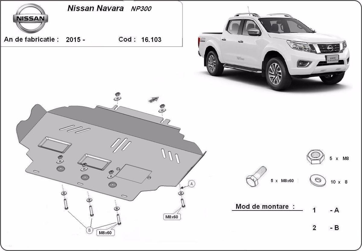 Cubre carter de Acero para Nissan Navara NP300 - D23 Año: 2015 - 2021 Motor: Todas las motorizaciones Caja cambio: Grosor: 2.5mm Agujero para aceite: Con hueco para el tapon de aceite. Protege: motor Descripcion: Protecciones de acero o aluminio para el motor y la caja de cambios.