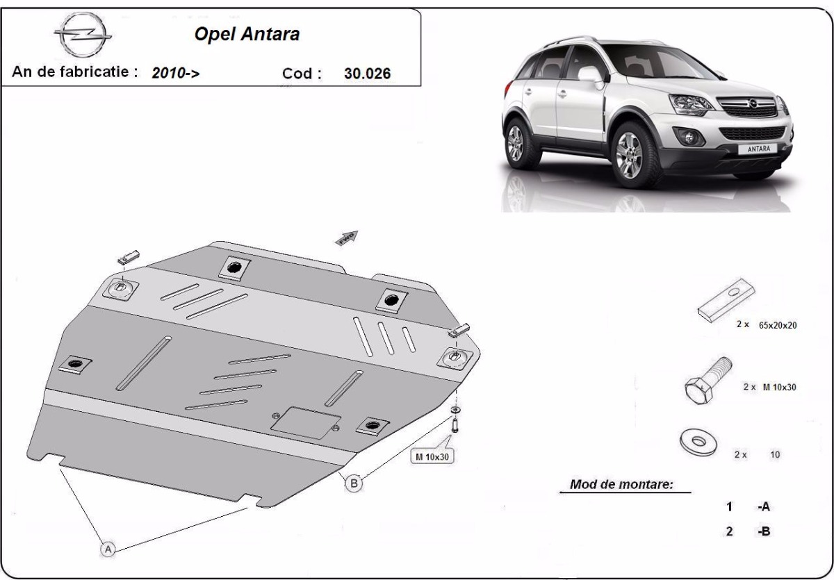 Cubre carter de Acero para Opel Antara Año: 2010 - 2015 Motor: Todas las motorizaciones Caja cambio: Grosor: 2mm Agujero para aceite: Con hueco para el tapon de aceite. Protege: motor, caja de cambios Descripcion: Protecciones de acero o aluminio para el motor y la caja de cambios.