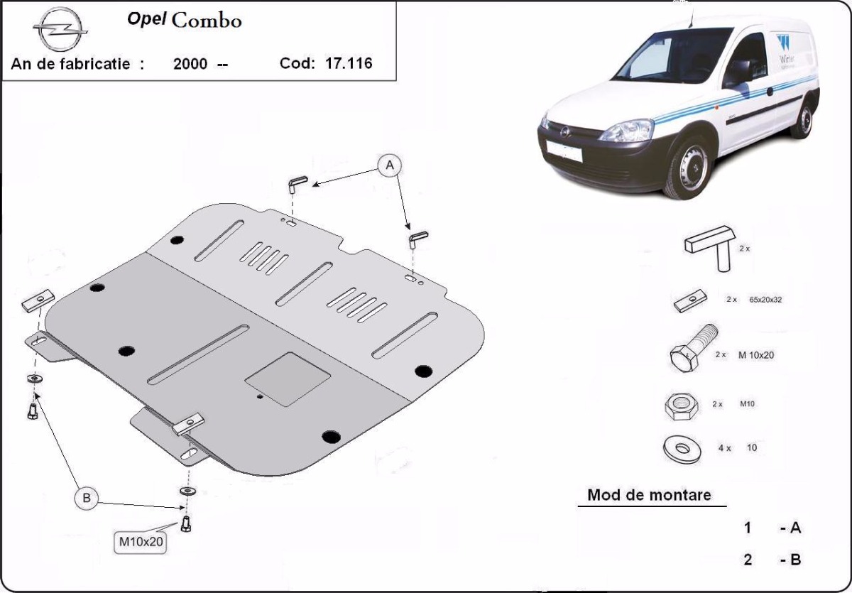 Cubre carter de Acero para Opel Combo C Año: 2000 - 2010 Motor: Todas las motorizaciones Caja cambio: Grosor: 2mm Agujero para aceite: Con hueco para el tapon de aceite. Protege: motor, caja de cambios, radiador Descripcion: Protecciones de acero o aluminio para el motor y la caja de cambios.
