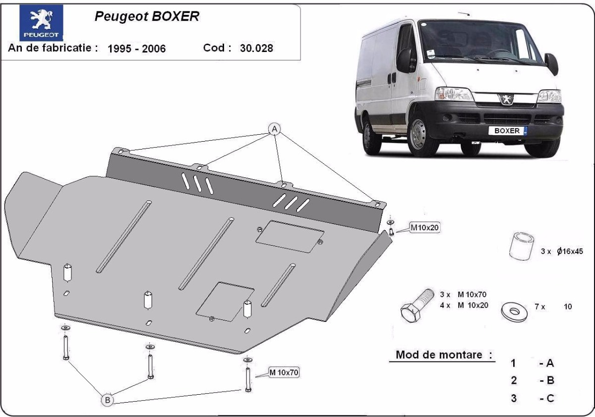 Cubre carter de Acero para Peugeot Boxer Año: 1996 - 2006 Motor: Todas las motorizaciones Caja cambio: Grosor: 2mm Agujero para aceite: Con hueco para el tapon de aceite. Protege: motor, caja de cambios Descripcion: Protecciones de acero o aluminio para el motor y la caja de cambios.