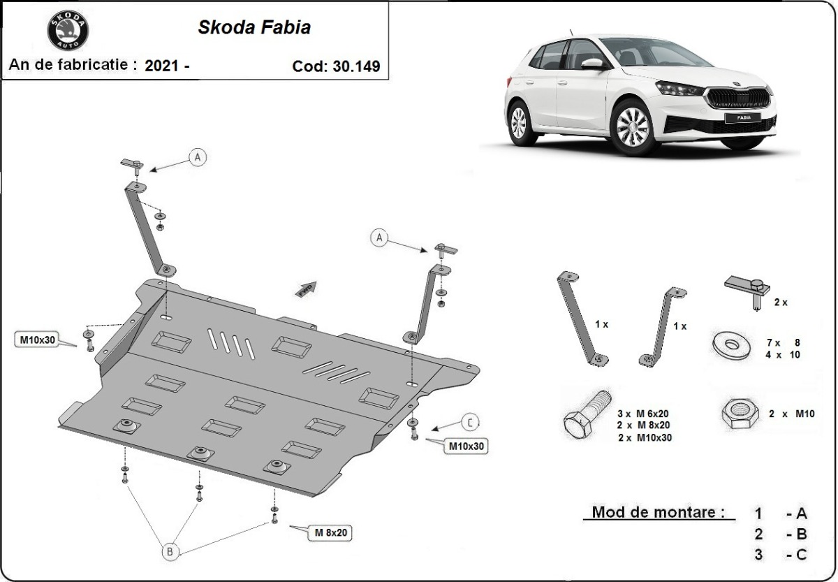 Cubre carter de Acero para Skoda Fabia Año: 2021 - 2025 Motor: Todas las motorizaciones Caja cambio: Grosor: 2mm Agujero para aceite: Sin hueco para el tapon de aceite. Protege: motor, caja de cambios, radiador, parachoques delantero Descripcion: Protecciones de acero o aluminio para el motor y la caja de cambios.