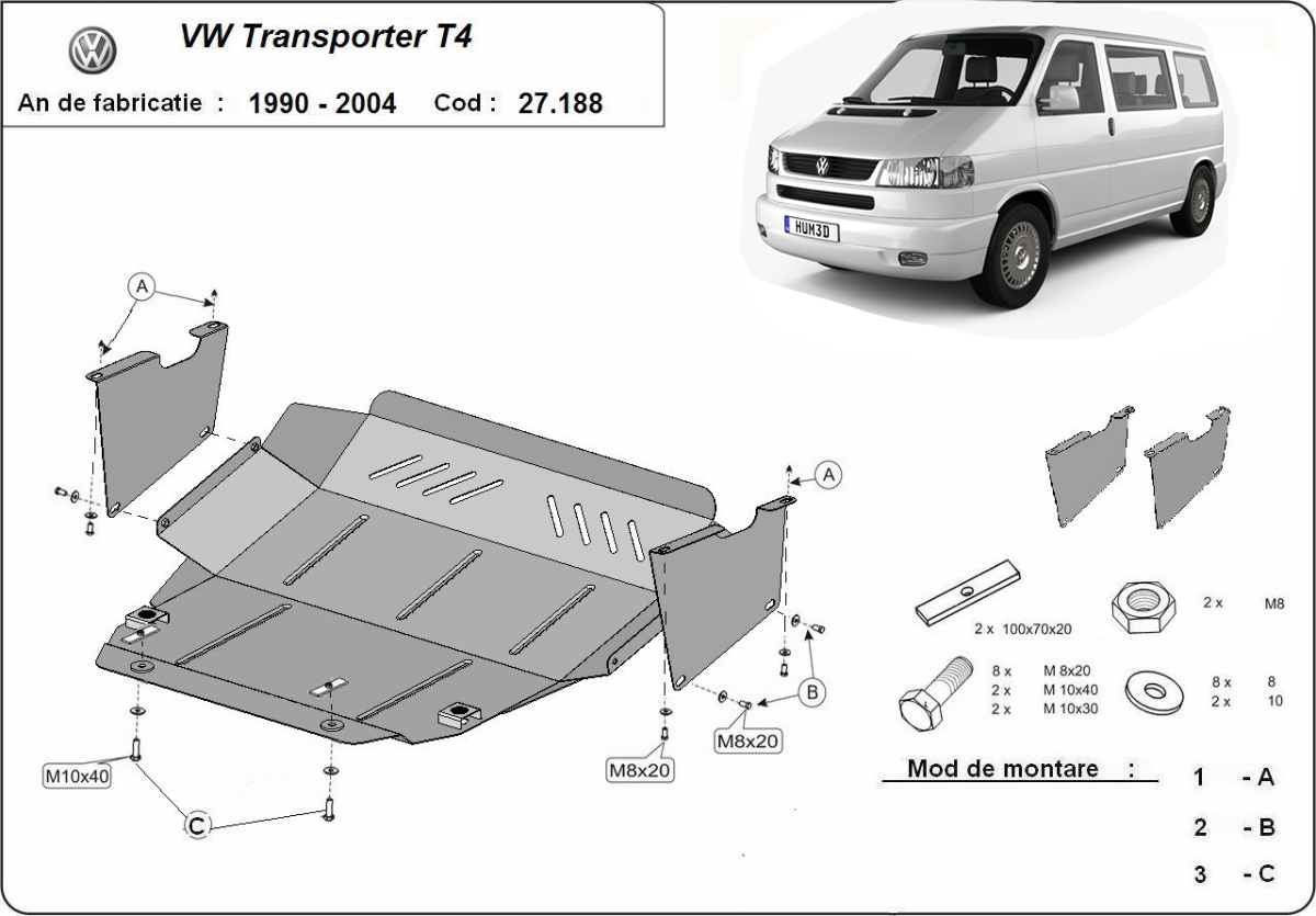 Cubre carter de Acero para VW Transporter T4 Caravelle Año: 1990 - 2003 Motor: Todas las motorizaciones Caja cambio: Grosor: 2mm Agujero para aceite: Sin hueco para el tapon de aceite. Protege: motor, caja de cambios Descripcion: Protecciones de acero o aluminio para el motor y la caja de cambios.