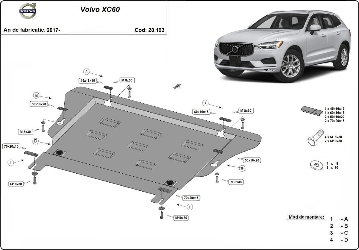 Cubre carter de Acero para Volvo XC60 Año: 2017 - 2025 Motor: Todas las motorizaciones Caja cambio: Grosor: 2mm Agujero para aceite: Sin hueco para el tapon de aceite. Protege: motor, caja de cambios Descripcion: Protecciones de acero o aluminio para el motor y la caja de cambios.
