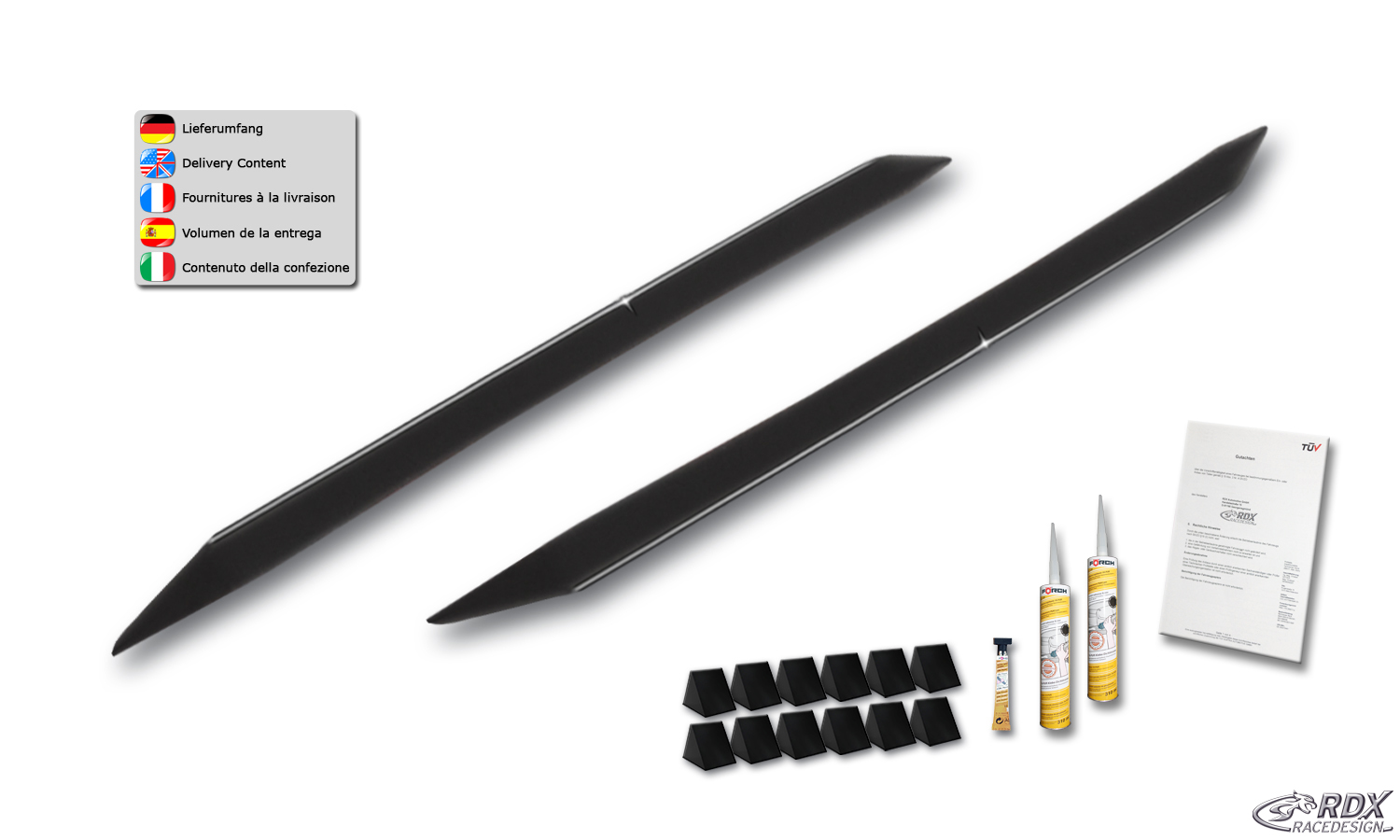 Faldones laterales RDX para BMW X1 E84 "Slim" Conjunto para ambos lados. Fabricado en plástico ABS. Negro de alto brillo. Incluye homologación TUV y accesorios de instalación. Contenido de la entrega: > Juego de faldones laterales (izquierdo y derecho) > Accesorios de instalación > Homologación TUV