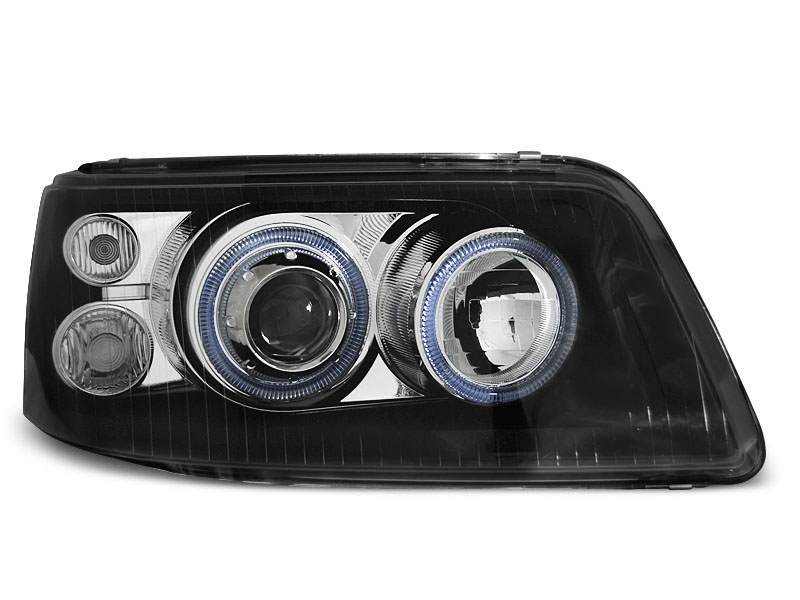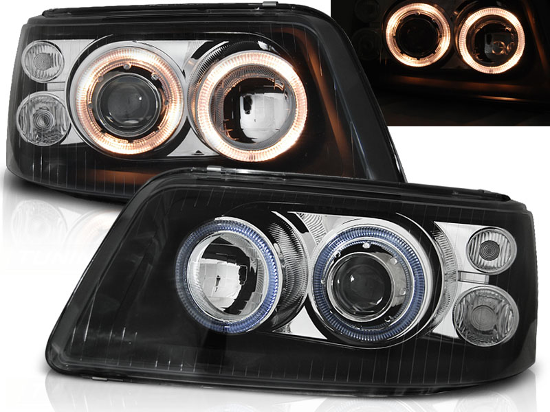 FAROS DELANTEROS ANGEL EYES VW T5 04.03-08.09 Fondo Negro - Faros delanteros con 2 ojos de angel - Articulo nuevo, Pareja (Izquierdo+Derecho), Homologacion Europea E-Marcado- para uso legal. DETALLES: Luz posicion: Ojos Angel - Luz intermitente:P21W - Luz corta:H7 no incluida - Luz larga: H1 no incluida - Regulacion: Electrica (Preparado para regulacion electrica) ANGEL EYES RHD / LHD El tiempo de entrega del material puede ser de 7-9 dias
