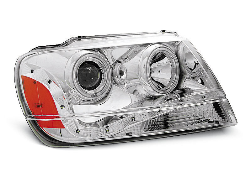 FAROS DELANTEROS ANGEL EYES CHRYSLER JEEP GRAND CHEROKEE 99-05.05 FAROS DELANTEROS LUZ DIURNA CROMADOS - Faros delanteros con 2 ojos de angel y luz posicion LED. - Articulo nuevo, Incluye la pareja (derecho-Izquierdo) Homologacion: NO HOMOLOGADO Luz posicion: LED y Ojos Angel CCFL- Luz corta:H7 incluida - Luz Larga: H1 incluida - Regulacion:manual (No puede instalarse regulacion electrica). LED ANGEL EYES CCFL El tiempo de entrega del material puede ser de 7-9 dias
