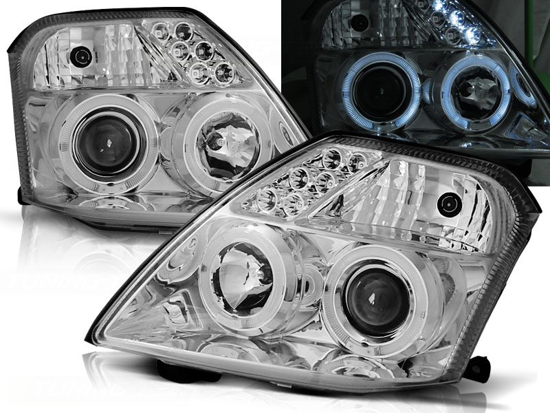 FAROS DELANTEROS ANGEL EYES CITROEN C2 09.03-10 ANGEL EYES CROMADOS - Faros delanteros con 2 ojos de angel - Articulo nuevo, Pareja (Izquierdo+Derecho), Homologacion Europea E-Marcado- para uso legal. DETALLES: Luz posicion: Ojos Angel - Luz intermitente:P21W - Luz corta:H1 incluida - Luz larga: H1 incluida - - Regulacion:manual (No puede instalarse regulacion electrica). ANGEL EYES El tiempo de entrega del material puede ser de 7-9 dias