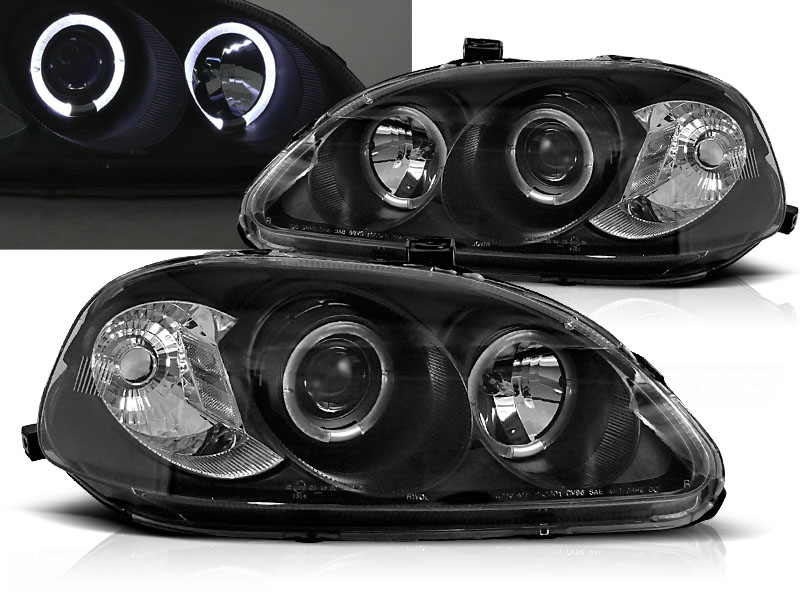 FAROS DELANTEROS ANGEL EYES HONDA CIVIC 09.95-02.99 Fondo Negro - Faros delanteros con 2 ojos de angel - Variante:2D/3D/4D - Articulo nuevo, Pareja (Izquierdo+Derecho), Homologacion Europea E-Marcado- para uso legal. DETALLES: Luz posicion: Ojos Angel - Luz intermitente:P21W - Luz corta:H1 incluida - Luz larga: H1 incluida - - Regulacion:manual (No puede instalarse regulacion electrica). ANGEL EYES El tiempo de entrega del material puede ser de 7-9 dias