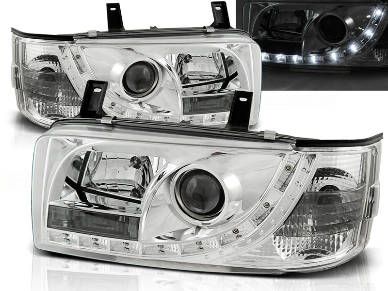 VW T4 90-03.03 TRANSPORTER FAROS DELANTEROS LUZ DIURNA CROMADOS - Faros delanteros luz diurna LED. - Articulo nuevo, Pareja (Izquierdo+Derecho), Homologacion Europea E-Marcado- para uso legal. DETALLES: Luz posicion: LED- Luz intermitente:P21W - Luz corta:H1 incluida - Luz larga: H1 incluida - Regulacion: Electrica (Regulador electrico no incluido) LED El tiempo de entrega del material puede ser de 7-9 dias