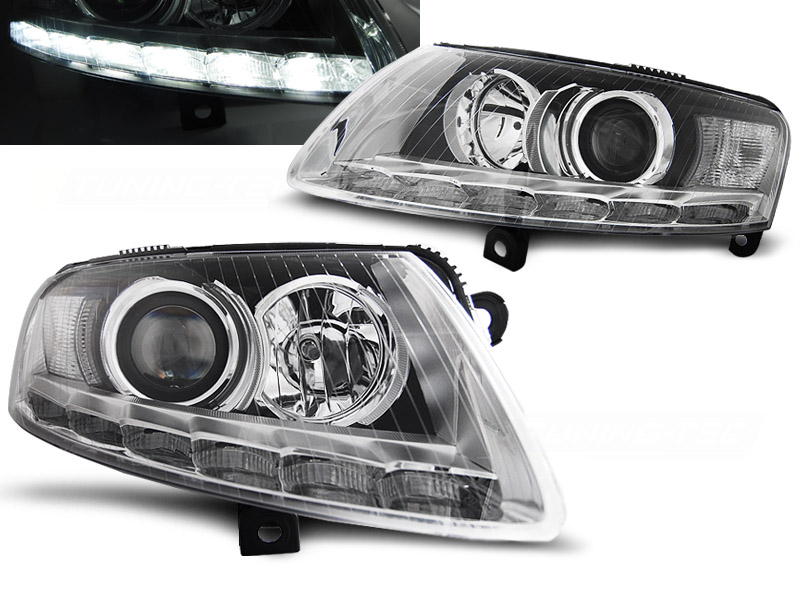 AUDI A6 C6 04.04-08 FAROS DELANTEROS LUZ DIURNA XENON CROMADO DRL - Faros delanteros con Luz Diurna (DRL).(bulb P21W) in the orginal headlights and without AFS.Xenon headlightswith Daytime Running Lights (DRL).Tipo Hi-Low (cruce y larga). - Articulo nuevo, Pareja (Izquierdo+Derecho), Homologacion Europea E-Marcado E4 - approved, ECE-R87 Homologacion. DETALLES: DRL: LED Luz posicion: LED- Luz intermitente:PY21WLow and - Luz Larga:D2Sno incluida - Luz larga:H7 incluida - Regulacion: Electrica (Regulador electrico no incluido). LED TRU DRL XENON El tiempo de entrega del material puede ser de 7-9 dias