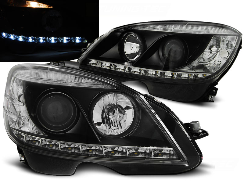 MERCEDES W204 07-10 FAROS DELANTEROS LUZ DIURNA NEGRO H7 - Faros delanteros luz diurna LED. - Articulo nuevo, Pareja (Izquierdo+Derecho), Homologacion Europea E-Marcado E6- approved.