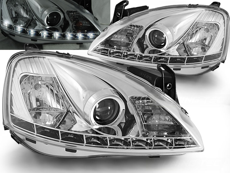 OPEL CORSA C 11.00-09.06 FAROS DELANTEROS LUZ DIURNA CROMADOS - Faros delanteros luz diurna LED. - Articulo nuevo, Pareja (Izquierdo+Derecho), Homologacion Europea E-Marcado- para uso legal. DETALLES: Luz posicion: LED- Luz intermitente:P21W - Luz corta:H1 incluida - Luz larga: H1 incluida - Regulacion: Electrica (Regulador electrico no incluido) LED El tiempo de entrega del material puede ser de 7-9 dias