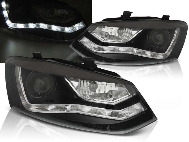 VW POLO 6R 09-03.14 FAROS DELANTEROS LUZ DIURNA FONDO NEGRO - Faros delanteros luz diurna LED. - Articulo nuevo, Pareja (Izquierdo+Derecho), Homologacion Europea E-Marcado E4 - para uso legal. DETALLES: Luz posicion: LED- Luz intermitente:PY21W Low and - Luz Larga:H9 incluida - Regulacion: Electrica (electrical adjuster is incluida) LED El tiempo de entrega del material puede ser de 7-9 dias