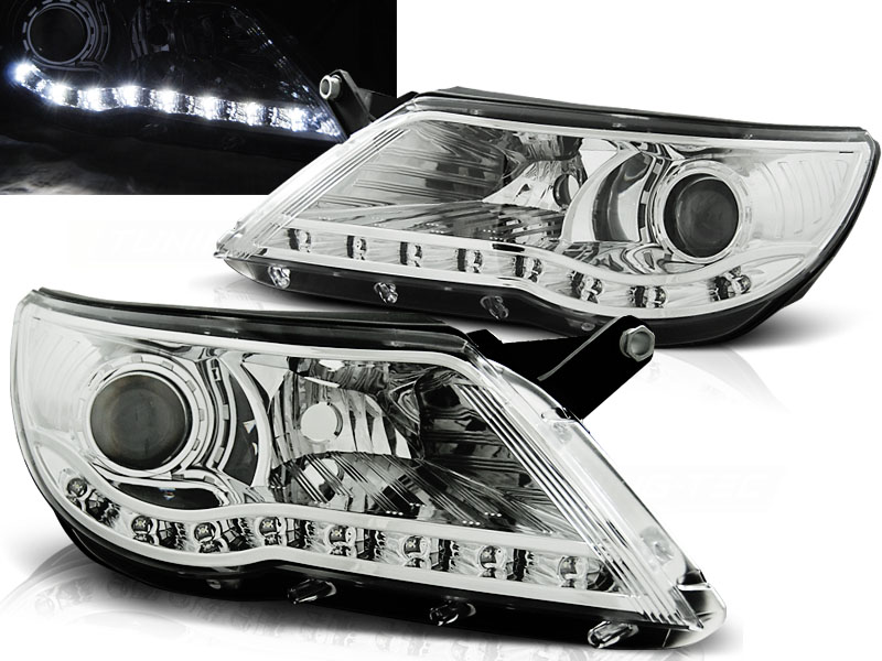 VW TIGUAN 10.07-11 FAROS DELANTEROS LUZ DIURNA CROMADOS - Faros delanteros luz diurna LED.Tipo Hi-Low (cruce y larga). - Articulo nuevo, Pareja (Izquierdo+Derecho), Homologacion Europea E-Marcado- para uso legal. DETALLES: Luz posicion: LED- Luz intermitente:P21W Low and - Luz Larga:H7 no incluida - Regulacion: Electrica (Preparado para regulacion electrica). LED El tiempo de entrega del material puede ser de 7-9 dias