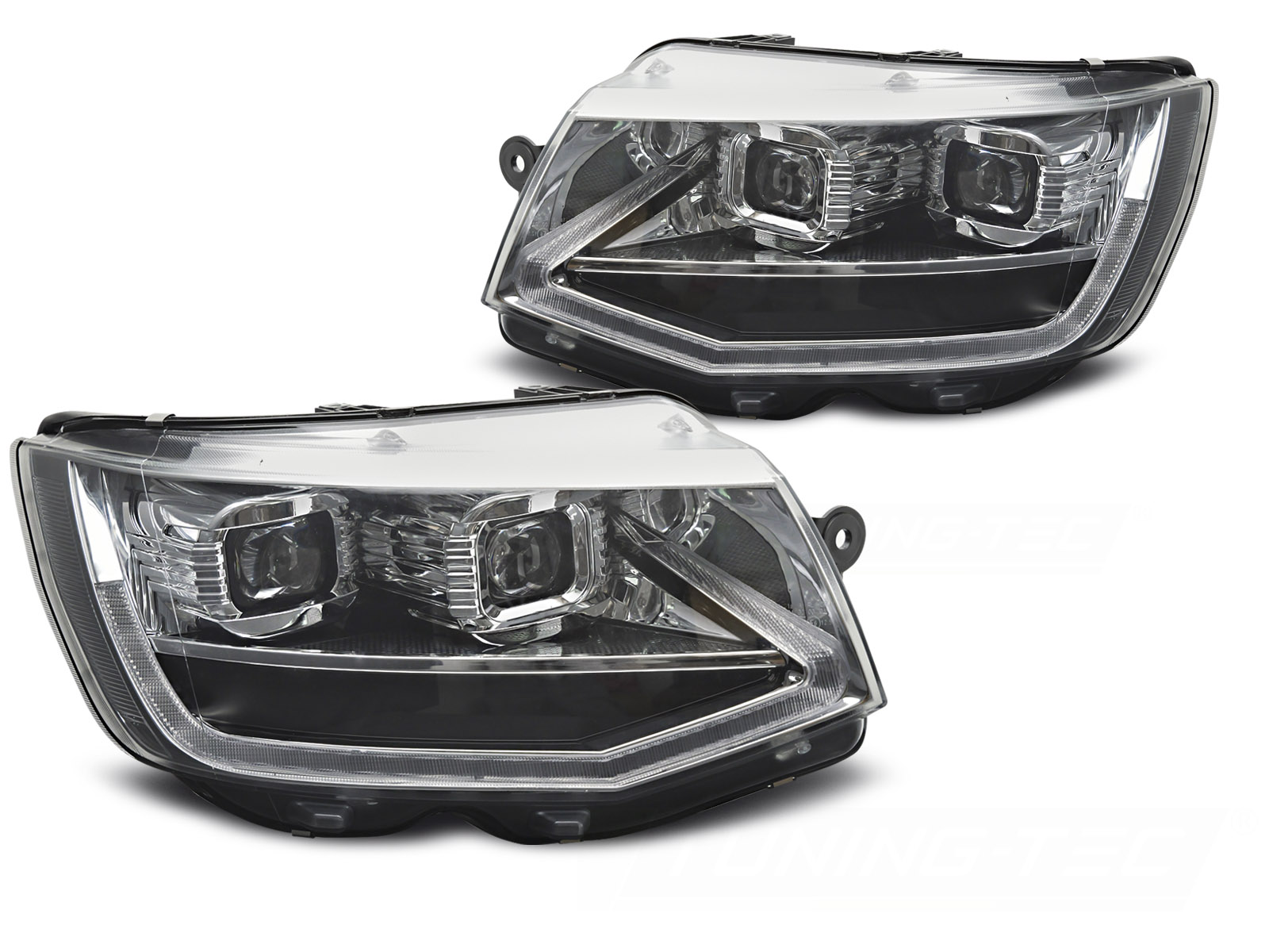 FAROS LED TUBO DE LUZ CROMADOS DRL SEQUENCIALES para VW T6 15-19 Descripción: Faros LED con luces de circulación diurna (DRL). Reemplazo de faros halógenos estándar. Con intermitentes dinámicos. 100 % nuevos, se entregan en pares (izquierdo y derecho). Homologación: Marcado E E6, homologación ECE-R87. Detalles: DRL: LED; Luz de estacionamiento: LED; Intermitente: LED; Luz de cruce: LED; Luz de carretera: LED; Regulación: eléctrica (incluye regulador eléctrico). LED TRU DRL: intermitentes dinámicos .