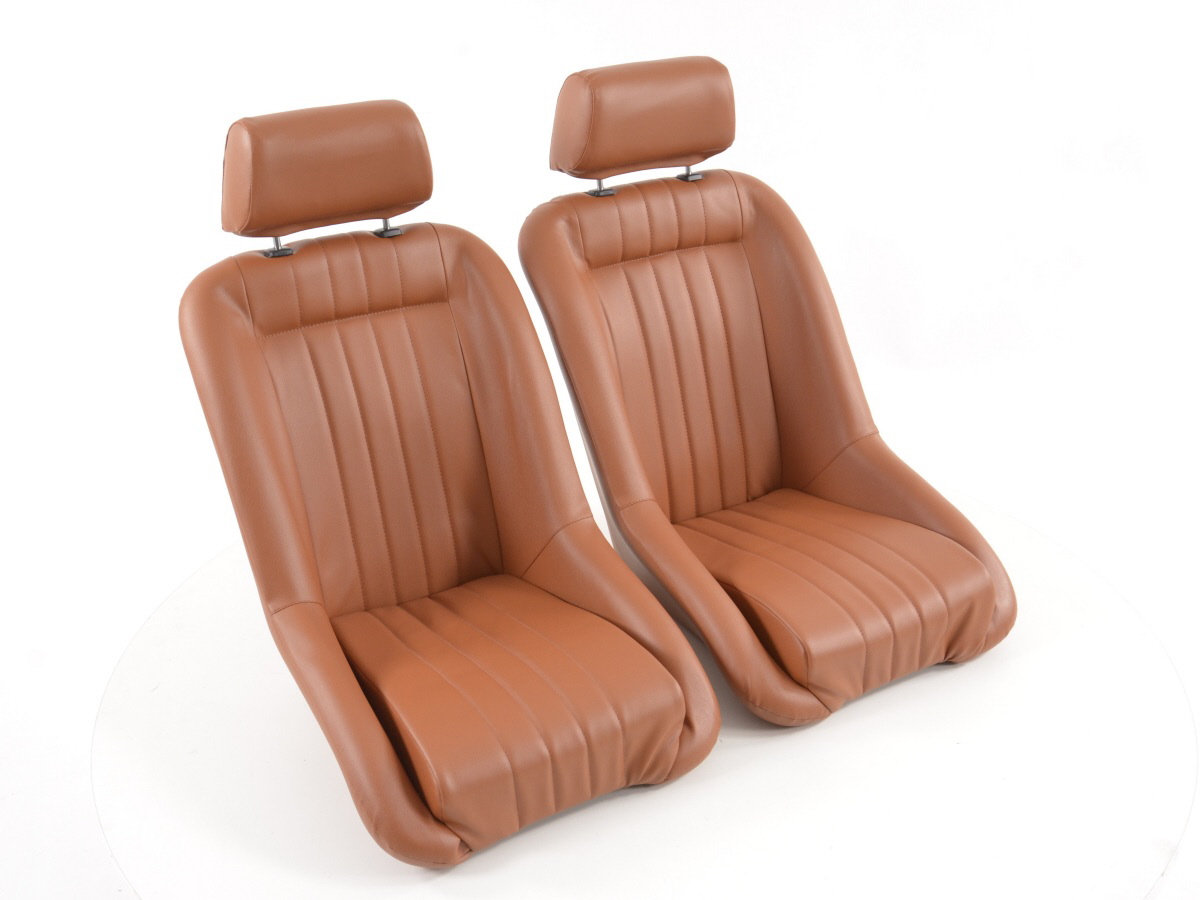 Asientos deportivos FK AUTOMOTIVE Color: asiento de cubo marrón claro en Retro-Look con reposacabezas El juego consta de 1xR + 1xL sin tapizado con certificado TüV: cuero artificial para nostalgia pura Elegancia intemporal