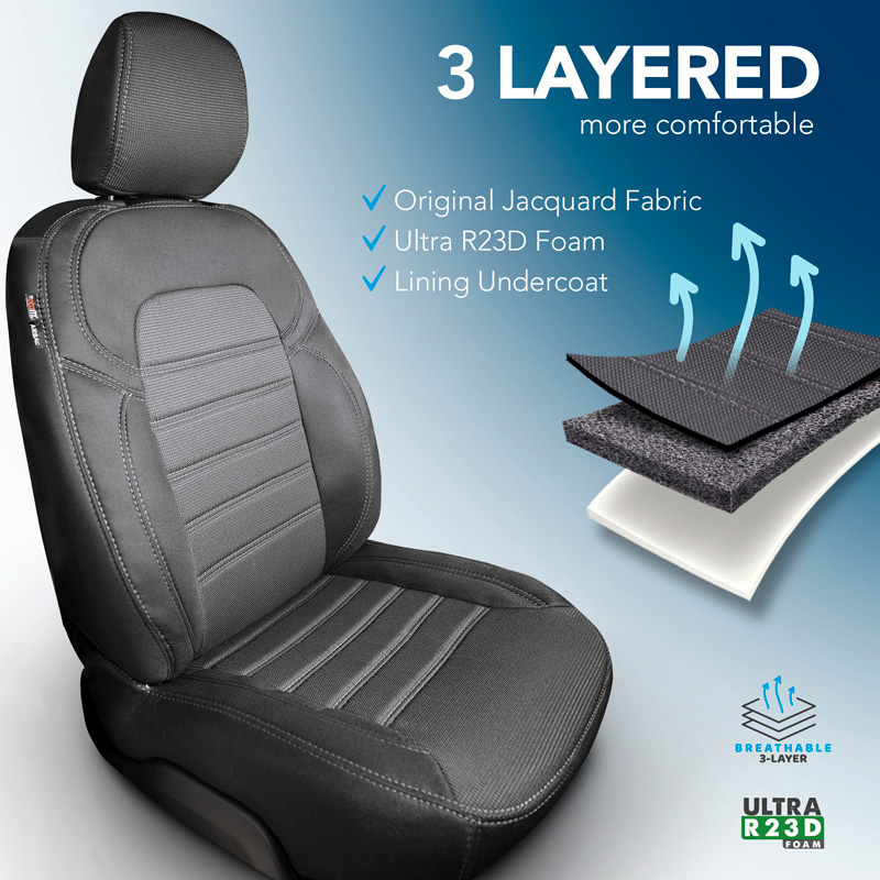 Juego de Fundas de asiento especificas furgoneta de alta calidad y 100% de ajuste. Las avanzadas técnicas de producción CNC garantizan un ajuste perfecto y aseguran que el interior del coche tenga el mismo aspecto que la tapicería original después de la instalación. Los conjuntos de diseño original están hechos de una combinación de tejidos de tapicería jacquard cosidos (asiento) y Lacoste (laterales/traseros) en color negro, acabados con costuras grises. La técnica especial de cosido hace que las fundas sean adecuadas para el funcionamiento normal del airbag original. Además de un ajuste perfecto, estos juegos ofrecen un confort óptimo de asiento y una protección duradera de su tapicería original contra el desgaste, la decoloración y/o la suciedad.