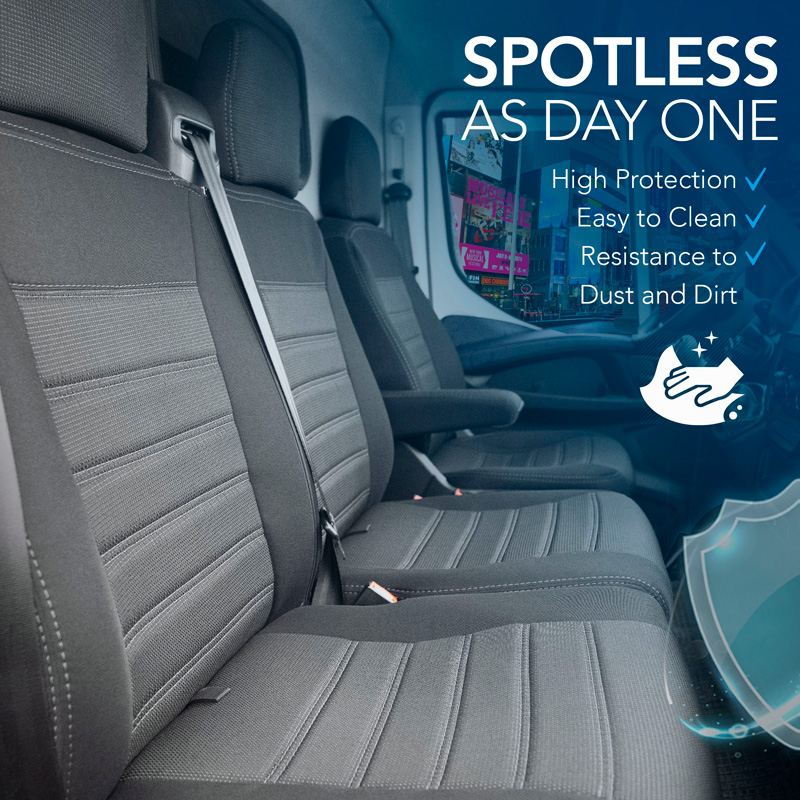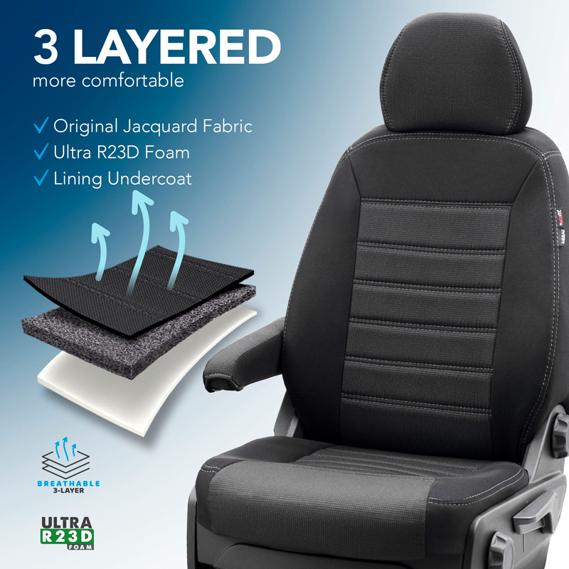 Juego de Fundas de asiento especificas furgoneta de alta calidad y 100% de ajuste. Las avanzadas técnicas de producción CNC garantizan un ajuste perfecto y aseguran que el interior del coche tenga el mismo aspecto que la tapicería original después de la instalación. Los conjuntos de diseño original están hechos de una combinación de tejidos de tapicería jacquard cosidos (asiento) y Lacoste (laterales/traseros) en color negro, acabados con costuras grises. La técnica especial de cosido hace que las fundas sean adecuadas para el funcionamiento normal del airbag original. Además de un ajuste perfecto, estos juegos ofrecen un confort óptimo de asiento y una protección duradera de su tapicería original contra el desgaste, la decoloración y/o la suciedad.
