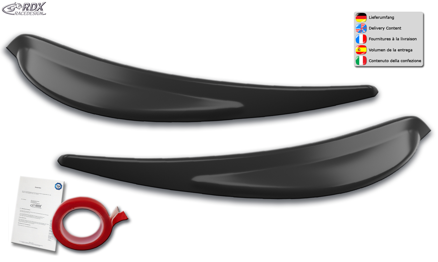 RDX Pestañas de faros para DACIA Lodgy & Dokker SD (2012-2022) Light Brows Conjunto para ambos lados. Fabricado en plástico PUR/ABS. Incluye homologación TUV y cinta adhesiva. Contenido de la entrega: > Cubiertas de faros / Faros delanteros (izquierdo y derecho) > Accesorios de instalación (Cinta adhesiva) > Homologación TUV
