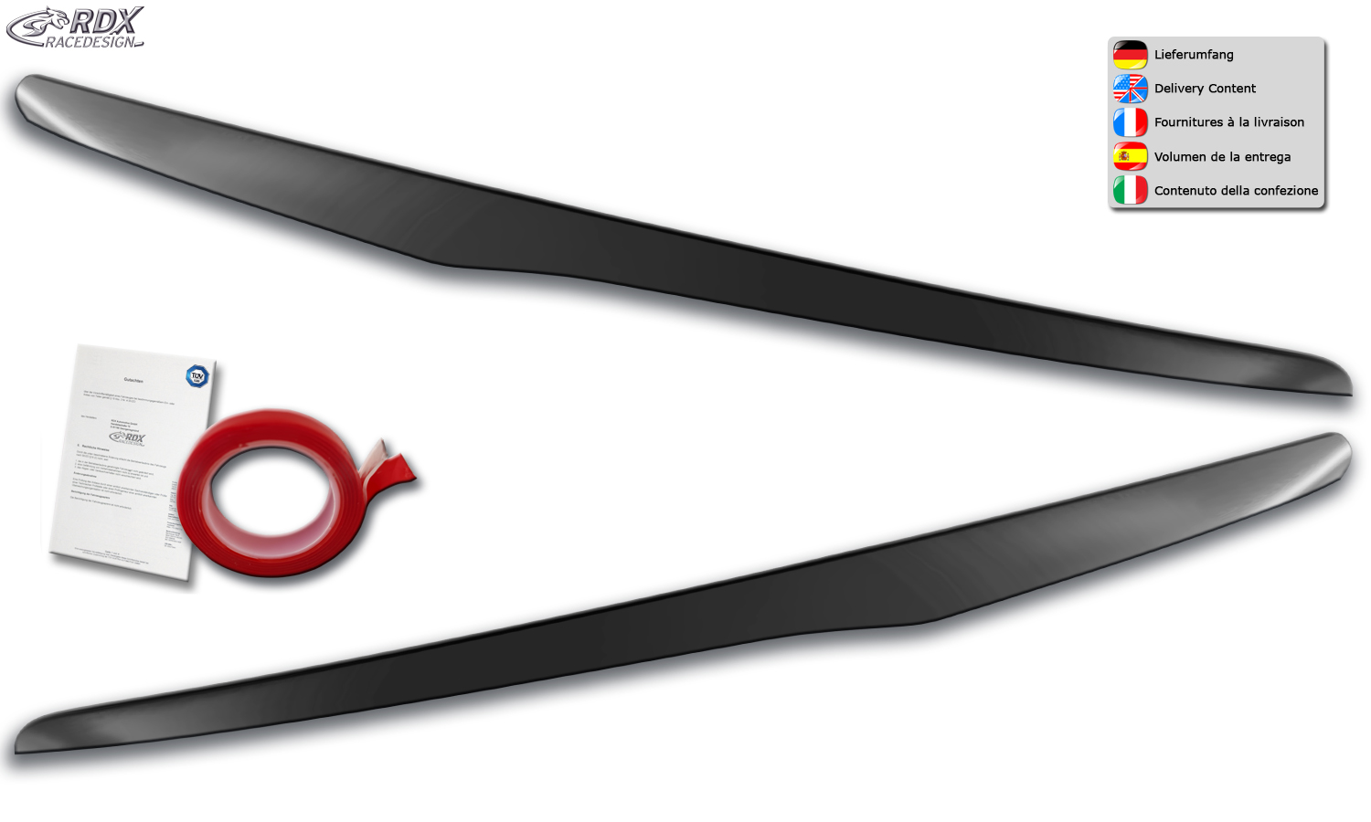 RDX Pestañas de faros para FORD B-Max JK8 (2012-2017) Light Brows Conjunto para ambos lados. Fabricado en plástico PUR/ABS. Incluye homologación TUV y cinta adhesiva. Contenido de la entrega: > Cubiertas de faros / Faros delanteros (izquierdo y derecho) > Accesorios de instalación (Cinta adhesiva) > Homologación TUV