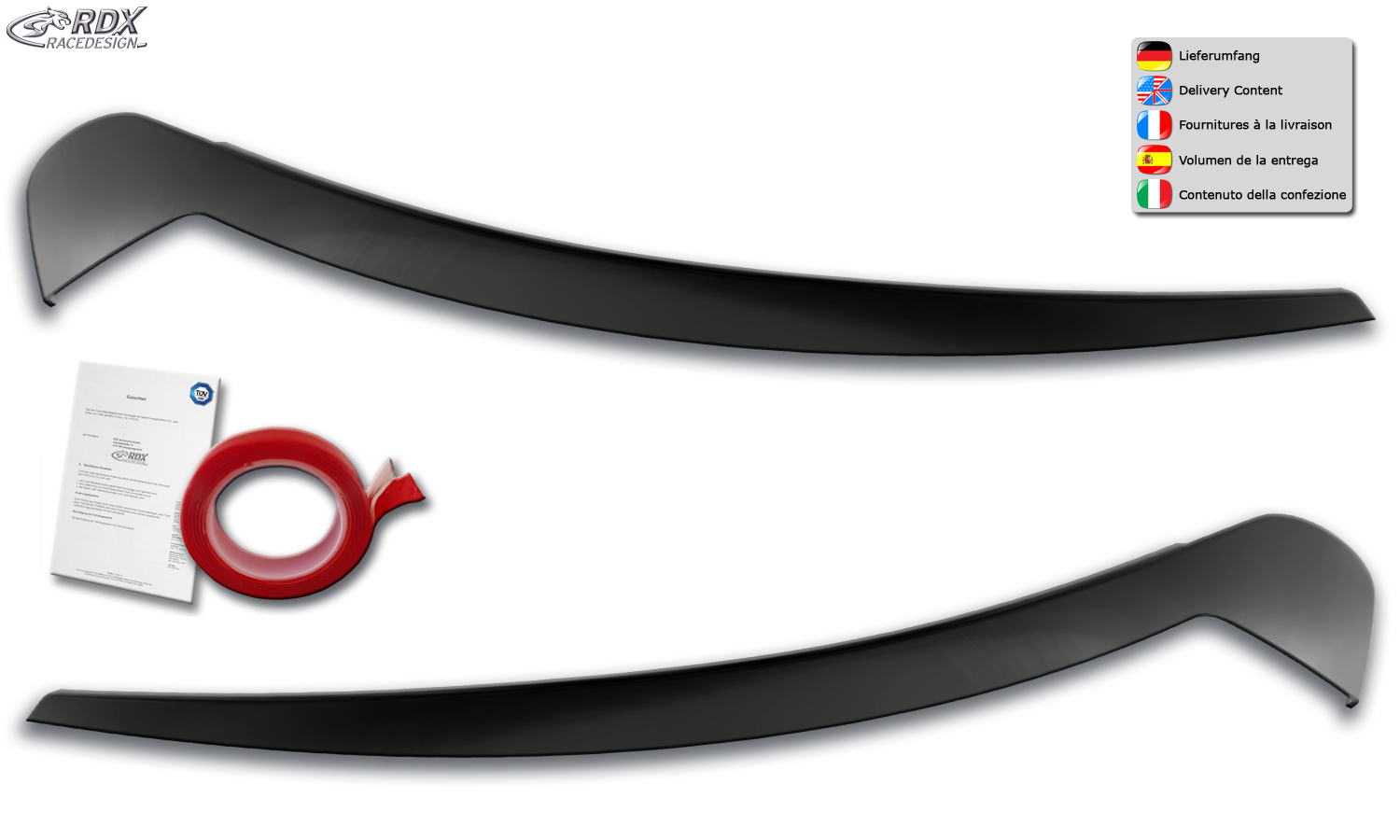 RDX Pestañas de faros para VW ID.3 ID3 E1 Light Brows Conjunto para ambos lados. Fabricado en plástico PUR/ABS. Incluye homologación TUV y cinta adhesiva. Contenido de la entrega: > Cubiertas de faros / Faros delanteros (izquierdo y derecho) > Accesorios de instalación (Cinta adhesiva) > Homologación TUV